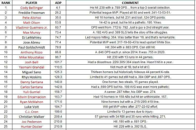 The 2020 fantasy baseball season, a wild ride if there ever was one, is over. It is early in the review process, the embers are still warm on the season, but we’re still going to start our review of the campaign by doing the following: we will take a look at the top player at each position based upon their 2020 NFBC ADP marks (the results are from the 203 drafts from July 1st, 2020 onward). How did the players perform based upon their expectations? We shall endeavor to find out.