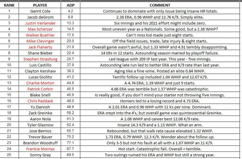 RED denotes a failure to match expectations. There were 24 at the starting pitcher position.