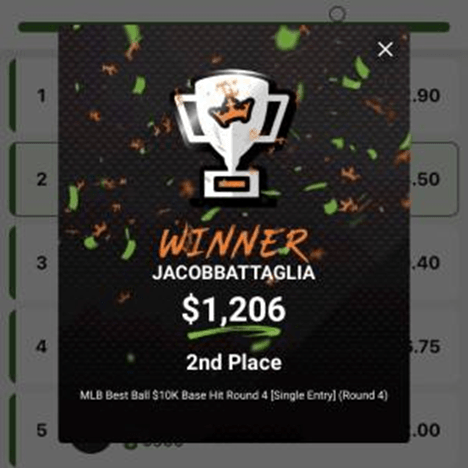 JakeB (jumantesupreme) – meant to get back on you about this one but I came in 2nd in DKs MLB Best Ball! $12 buy in and the seasonal fantasy guide you did bringing me $1200 ain’t too shabby lol! Just wanted you to know that your hard work doesn’t go unnoticed and is greatly appreciated brother. Another big win for the Elite Mafia!
